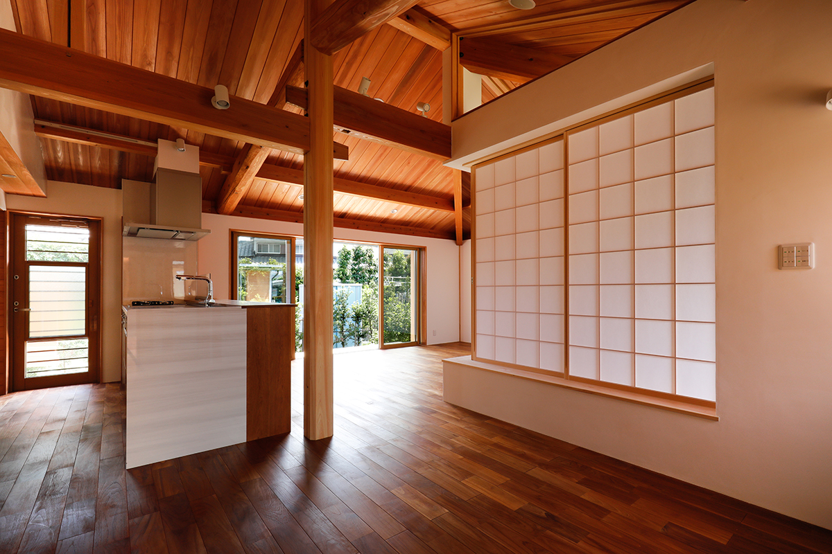 新築 塩新田の家 平屋 畳 中庭を介して爽やかな風を室内に呼び込み、通風で「涼」をとる。日本の夏を、健やかにしのぐ家です。本物の藁とイ草で作られた本物の琉球畳を使用。室内の壁は漆喰で、経年変化しても飽きのこない空間となりました。 コの字型の平屋づくり リビング&キッチン 小上がりの和室 寝室からの中庭の景色 玄関 廊下 工事規模 木造平屋建て 完成 2019年8月 延床面積 132.76㎡ 設計 門西建築